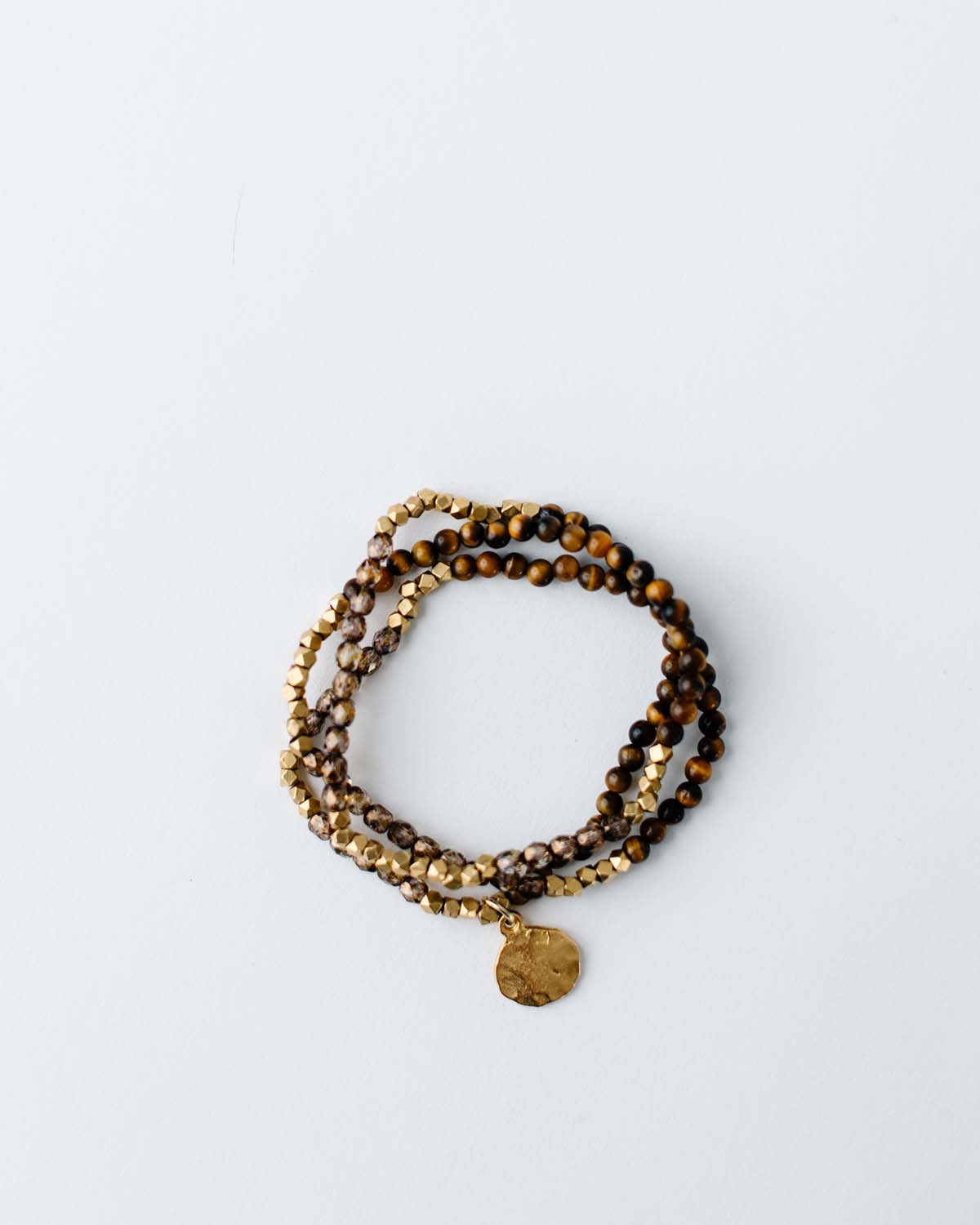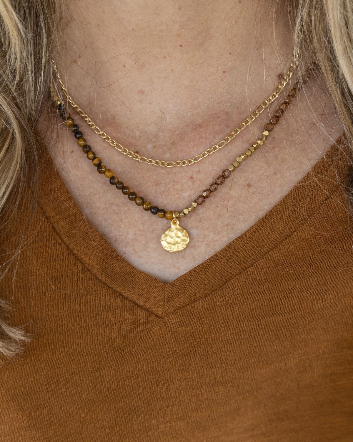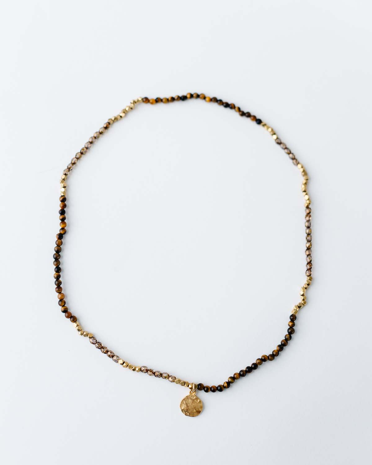 - Tiger eye, gold plated brass beads, glass beads, gold plated medallion