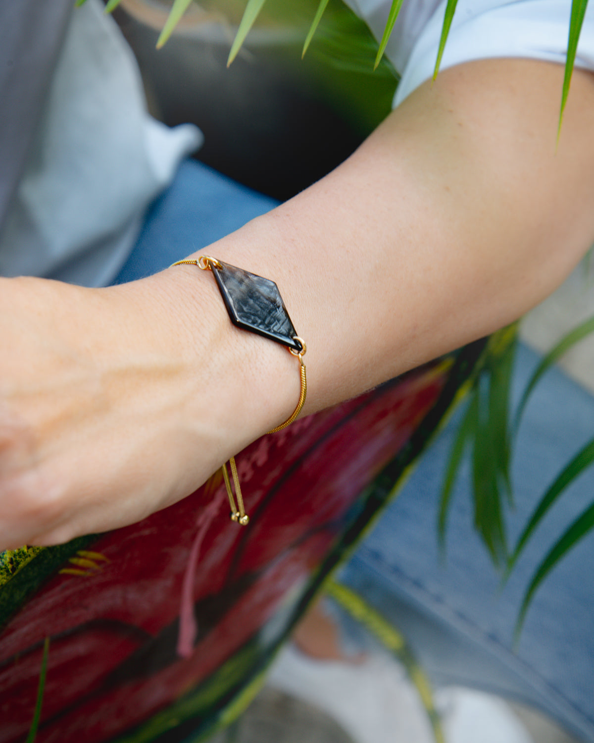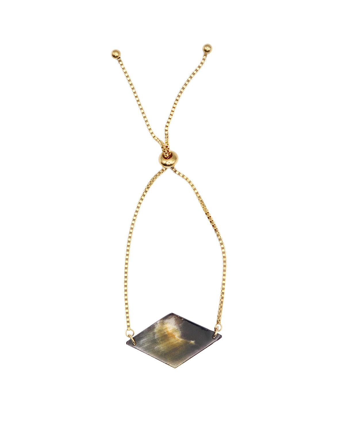 The Mia Bracelet is the perfect minimalistic piece for your wrist. Featuring hand polished horn in a diamond shape on a gold plated stainless steel chain with a fully adjustable slider. You're going to want this bracelet in your jewelry box!