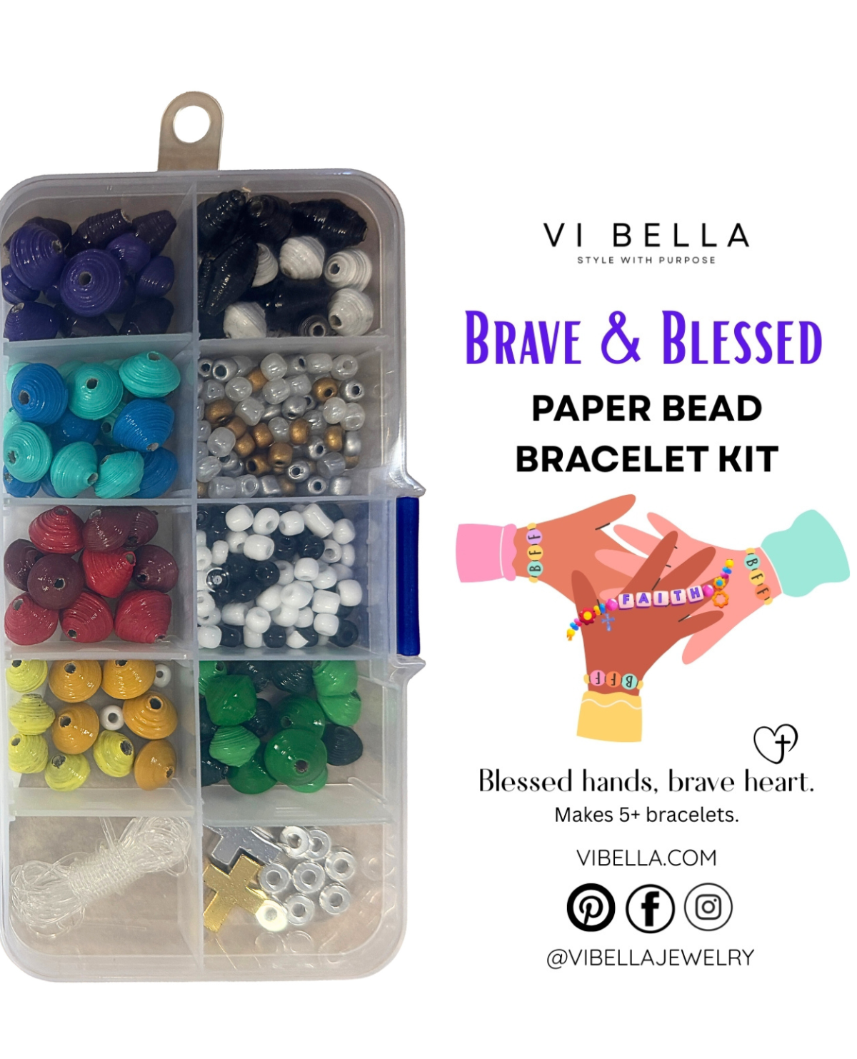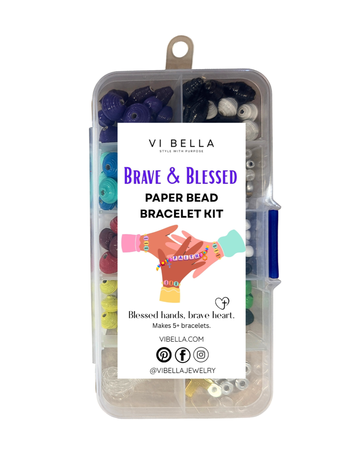 Craft stunning bracelets and necklaces with our Brave and Blessed Paper Bead Kit! Each kit features hand-rolled paper beads crafted by talented Vi Bella artisans in Haiti, paired with coordinating seed beads and charming cross accents. Perfect for creative minds of all ages, you'll create approximately 5 bracelets or 2 necklaces—endless possibilities for personalized jewelry and meaningful gifts. Dive into hours of hands-on fun while supporting artisan craftsmanship!
