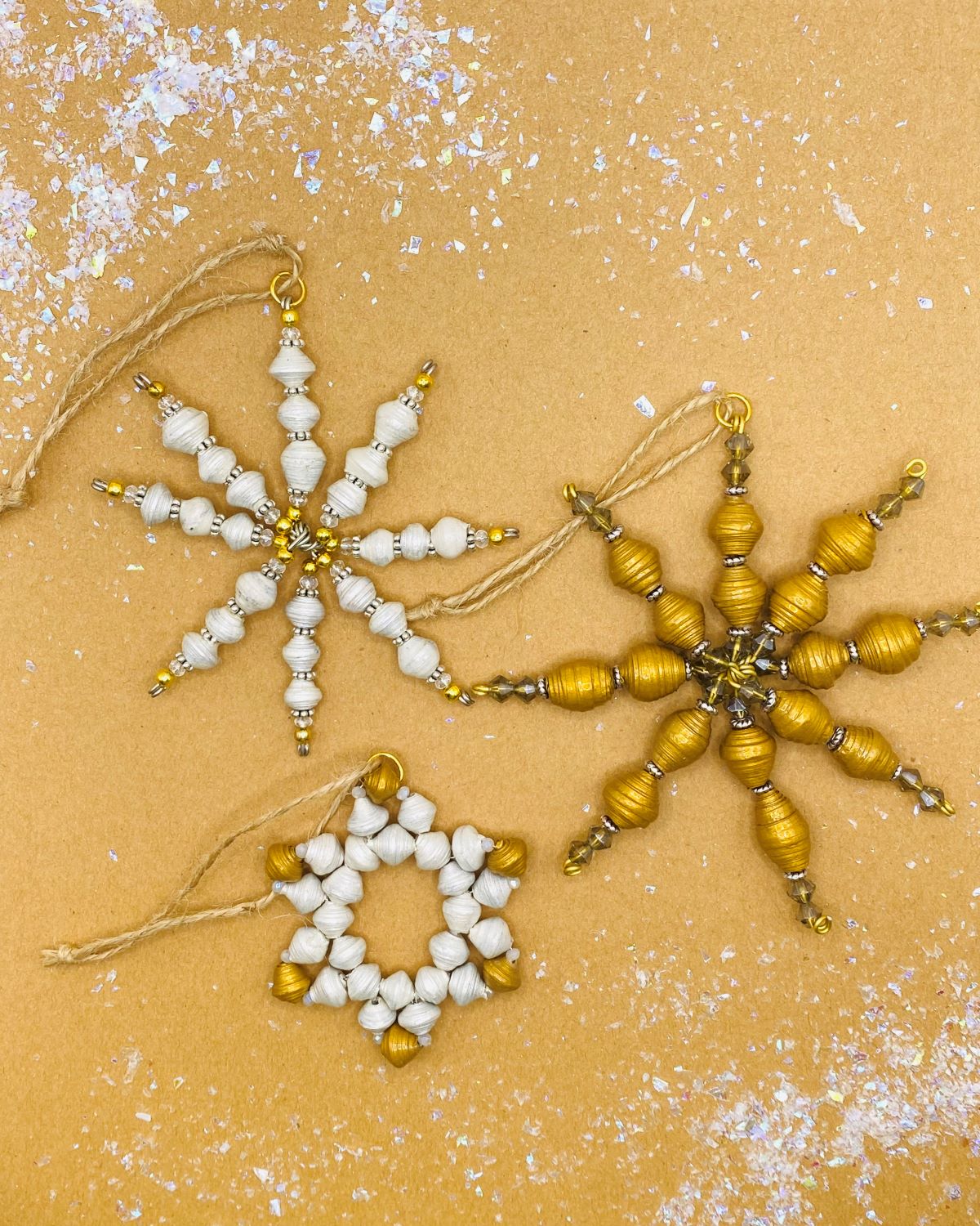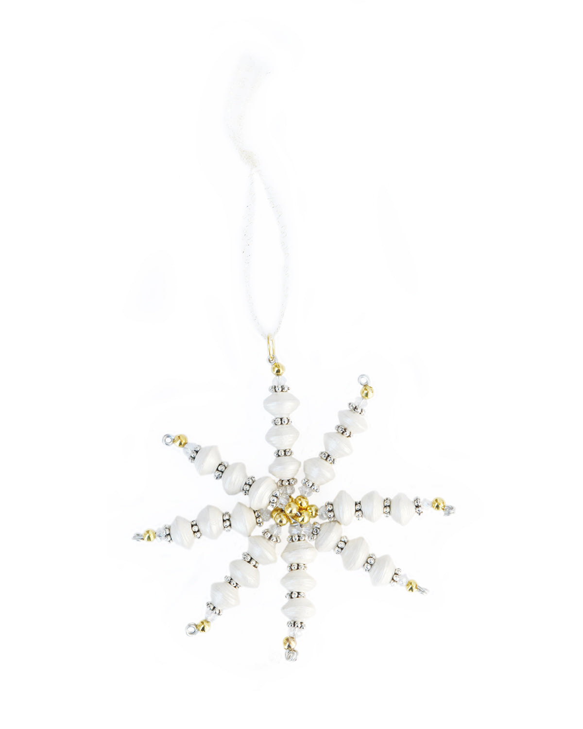 The Camila Snowflake Ornament is a gorgeous addition to your Christmas tree. Each paper bead is rolled by hand, making this ornament a work of art. Flanked by gold and silver faceted beads, this will coordinate with any Christmas decor. Each purchase helps give steady employment to the artisans that made these ornaments.