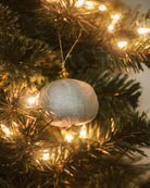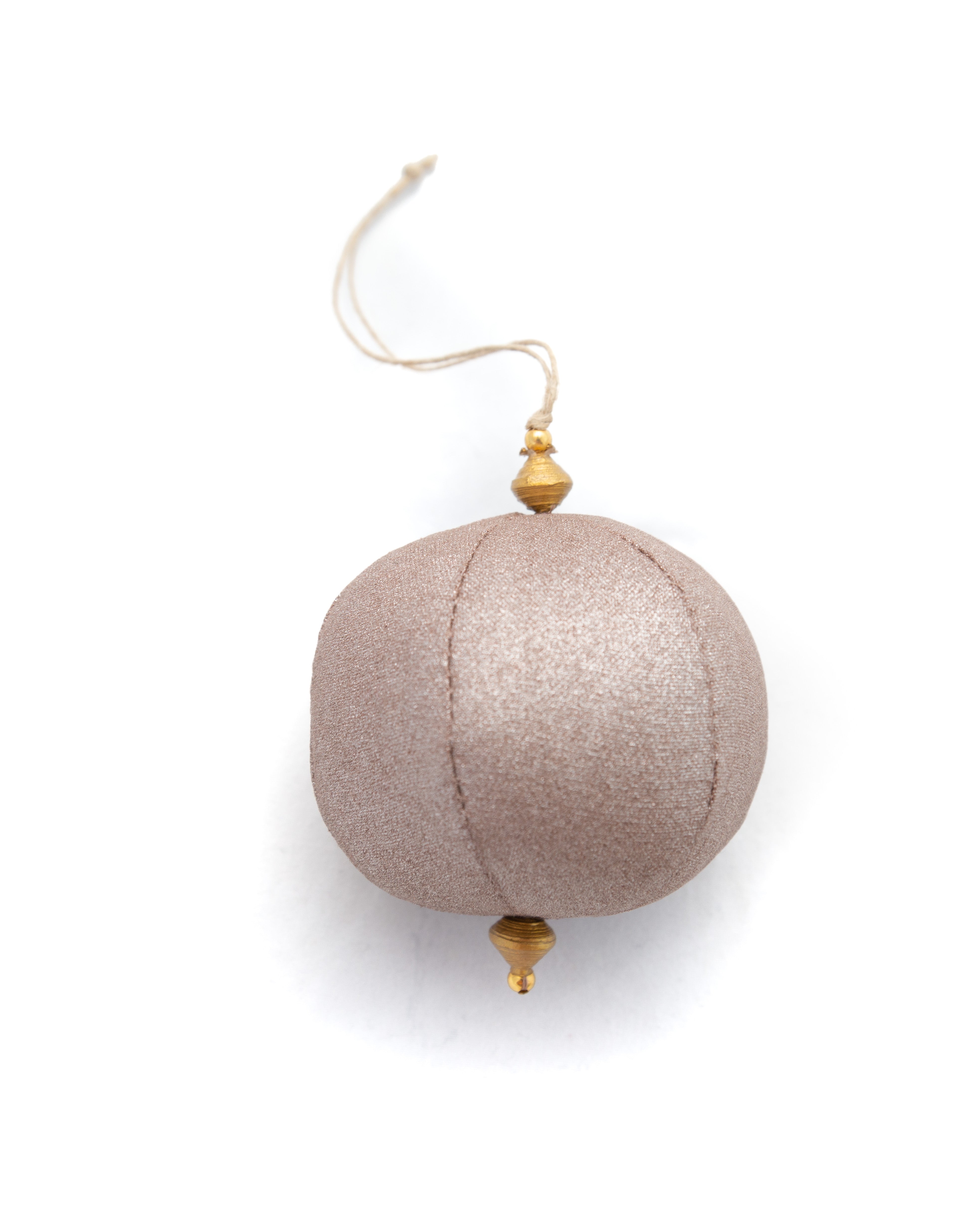 The Willa Ball Ornament from is made from a stylish metallic fabric, flanked on either side with a hand-rolled paper bead for added detail. Each purchase helps maintain steady employment and work to the artisans in Haiti that made these ornaments.