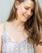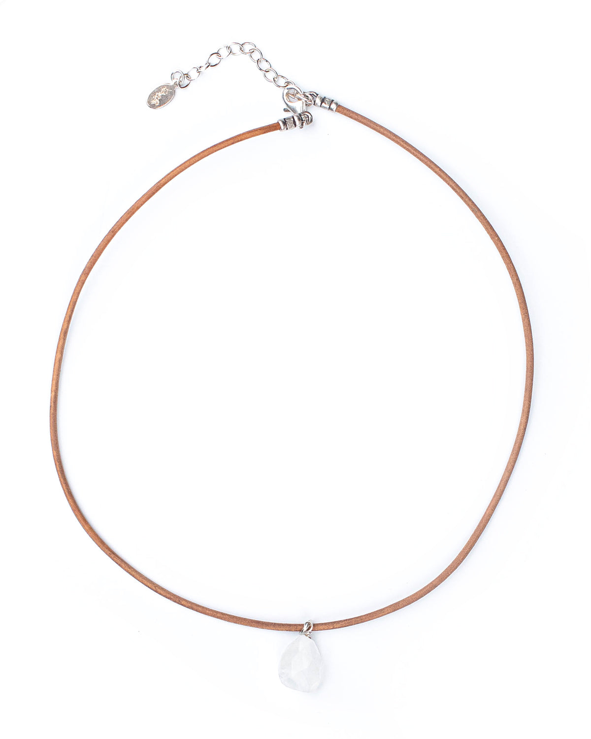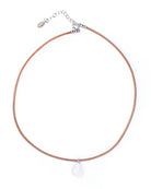 The Emie Lee Necklace features a soft, Greek leather cord and a semi-precious rainbow moonstone pendant. This piece, handmade in Mexico, is the perfect touch of simple, natural elements.