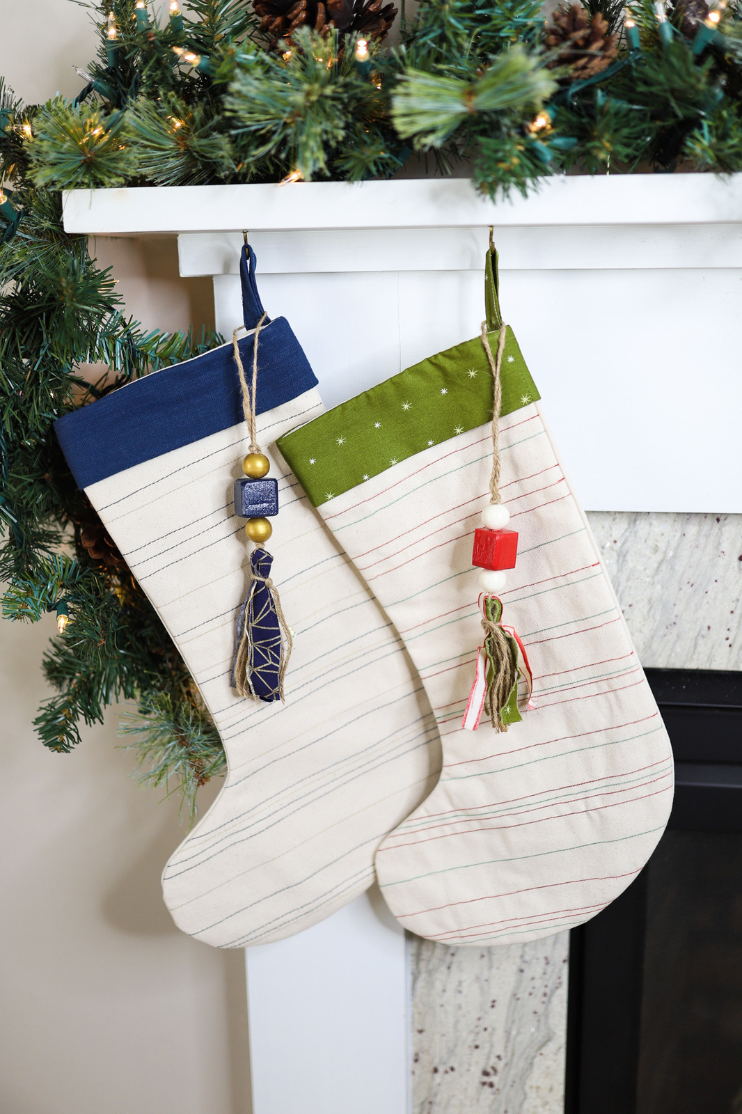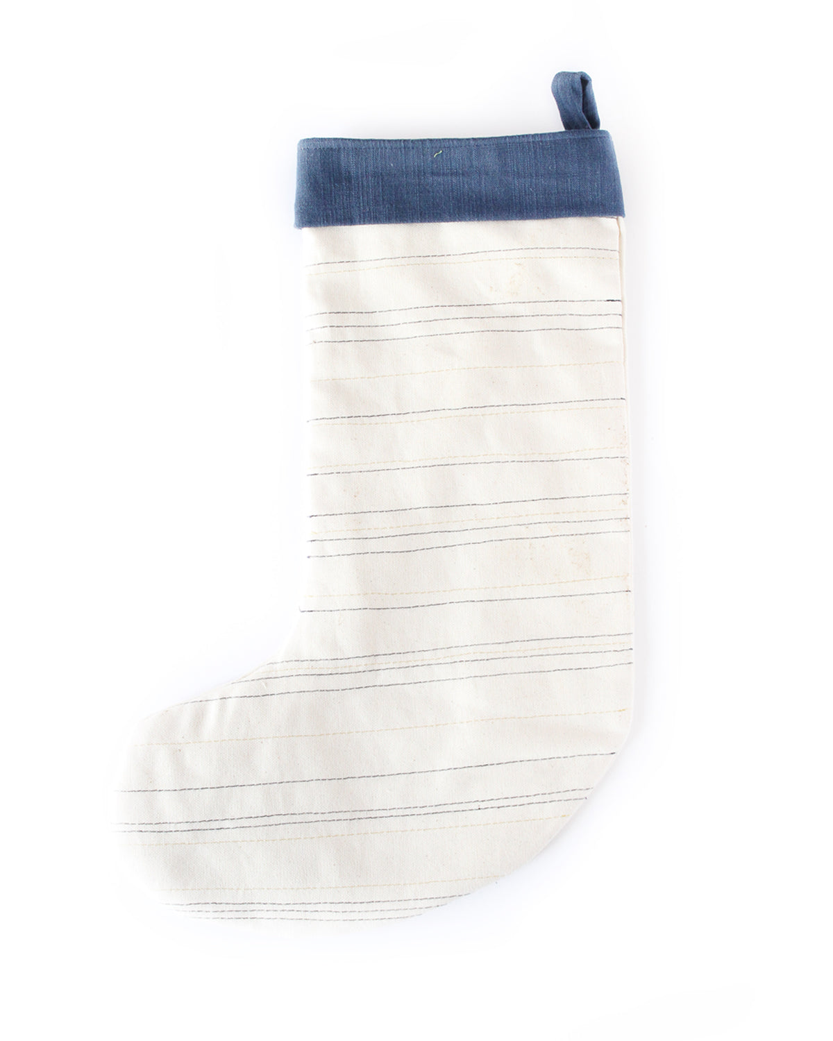 A gorgeous addition to your holiday decor and sure to be a cherished item for years to come. The stitching on these stockings is in navy and gold and is handcrafted by our artisans. Each stocking is unique and made with great attention to detail. Their generous size means you can stuff to your heart's desire.