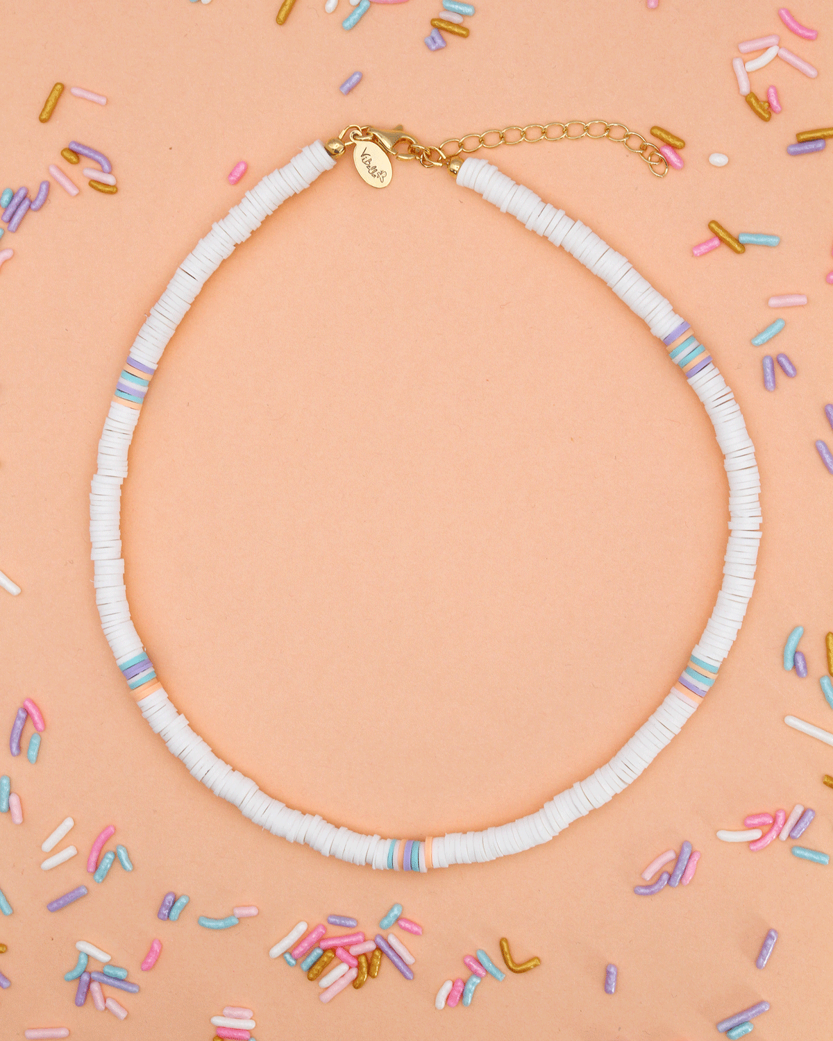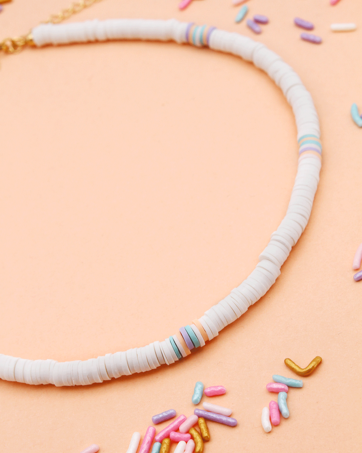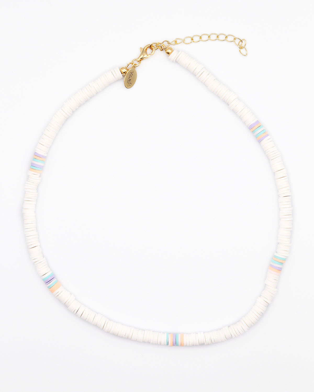 Details: 16-18 in long, white & pastel polymer clay beads, gold plated brass
