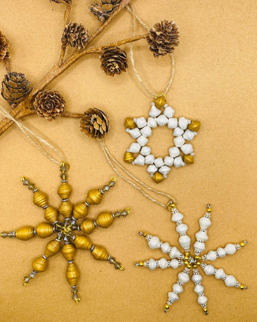 The Camila Snowflake Ornament is a gorgeous addition to your Christmas tree. Each paper bead is rolled by hand, making this ornament a work of art. Flanked by gold and silver faceted beads, this will coordinate with any Christmas decor. Each purchase helps give steady employment to the artisans that made these ornaments.