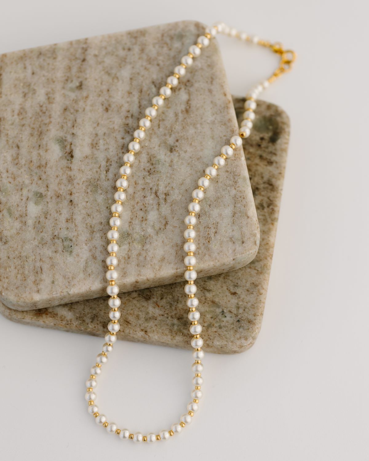 Experience everlasting elegance with our pearl and gold necklace. Alternating beads create a luxurious texture, while versatile layering options add trendy appeal. Try pairing it with the Redeemed or Demi Necklace for a fun look!