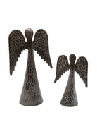 Two beautifully designed angels crafted from recycled oil drums. Artisans cut, hammer, and chisel each piece of metal by hand; making a beautiful treasure out of trash. These angels will look great on your mantle and make the perfect gift for your loved ones. They will especially love the story of redemption that these pieces tell.